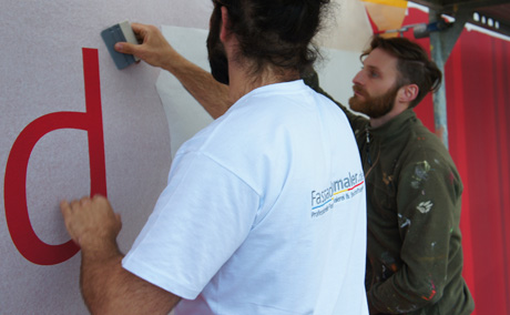 Im Bereich der professionellen Fassadenbeschriftung konnten wir uns in den letzten Jahren in Deutschland gut positionieren und haben in diesem Bereich schon einige große Referenzen vorzuweisen. Am häufigsten wir die Folientechnik für die Beschriftung an Wandfassaden angewendet. Mit speziellen hochleistungsfolien werden vorerst die gewünschten Buchstaben aufgeklebt, positioniert und dann mit Fassadenfarbe ausgemalt. |