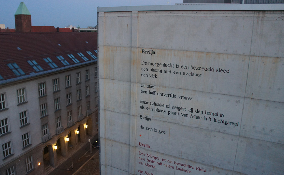Bei diesem Projekt wollte die niederländische Botschaft in Berlin ein holländisches Gedicht an die Fassadenfläche haben. Da es sich hierbei nicht um eine langfristige Gestaltung handelte, wurde die Gestaltung der Wandfläche mit der Spraydose behandelt. Die besondere Herausforderung war die handgemalte Kalligrafie, wir konnten uns keinen Fehler erlauben und hatten für jeden Buchstaben und Wort nur eine Chance, ohne die Möglichkeit diese auszubessern. |